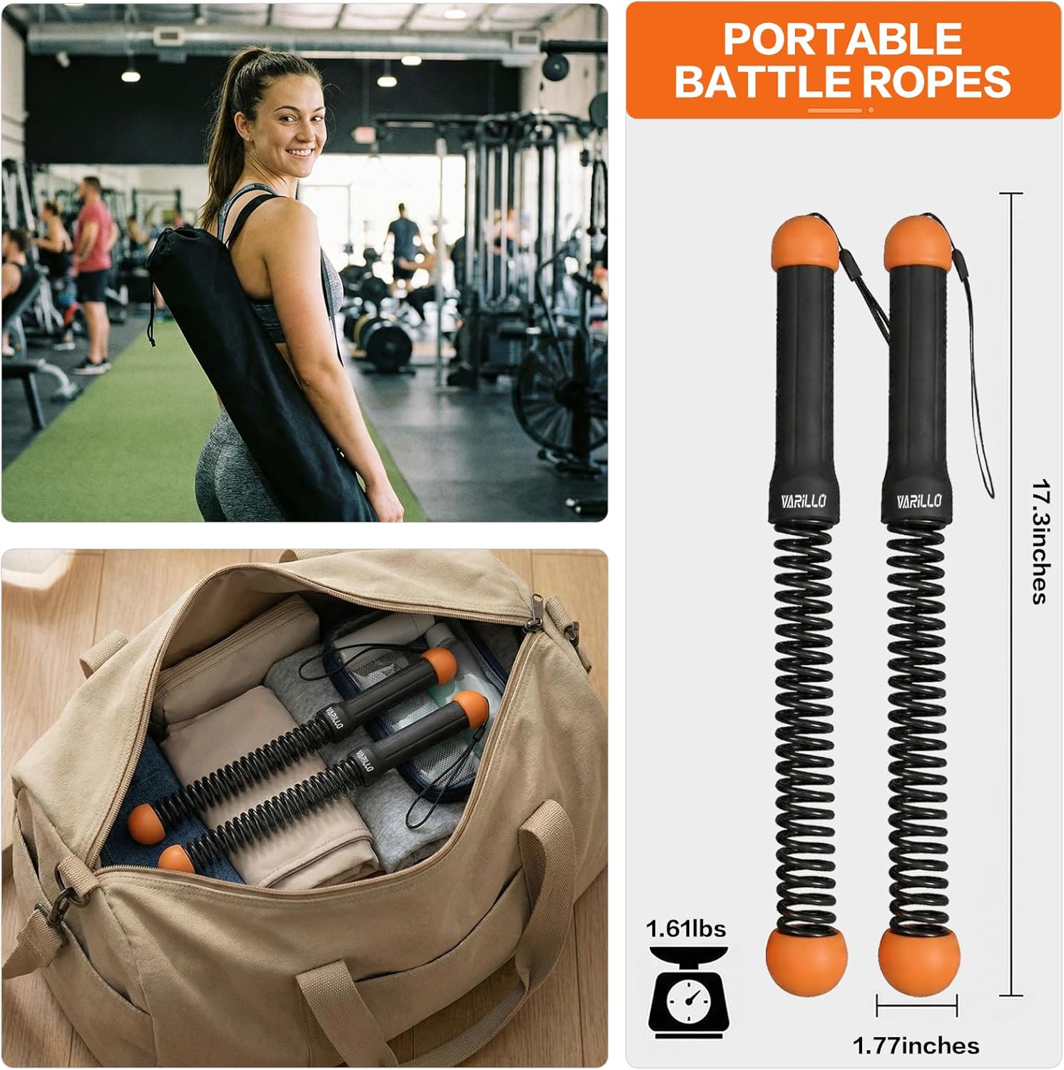 They simulate the same swinging motion as traditional battle ropes, but without the heavy rope or anchor point. The motion creates resistance and momentum that activates your arms, shoulders, core, and lets for a full-body workout.